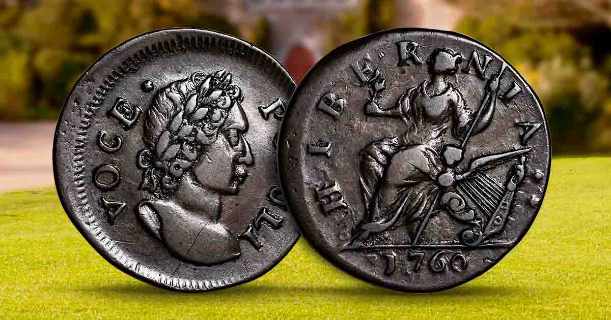 The reverse depicts a seated figure of Hibernia, facing left. Hibernia is holding a staff and to the right of the staff is a harp (representing Ireland). Around Hibernia is the motto “HIBERNIA” and below the seated Hibernia is the date, in exergue, of 1760.
