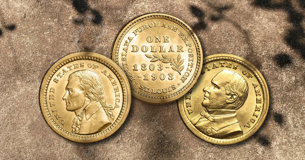 The Louisiana Purchase Exposition Dollar was issued in 1903 as the first gold commemorative coin struck by the U.S. Mint. It was struck to honor the centennial of the Louisiana Purchase and the 1904 St. Louis World’s Fair. The Louisiana Expo Dollar had two obverse varieties that shared a reverse design, with one obverse featuring President Thomas Jefferson and the other depicting President William McKinley. Between the two issues, the Louisiana Purchase Expo Dollar had a distribution of about 35,000 coins and a total mintage of 250,000.