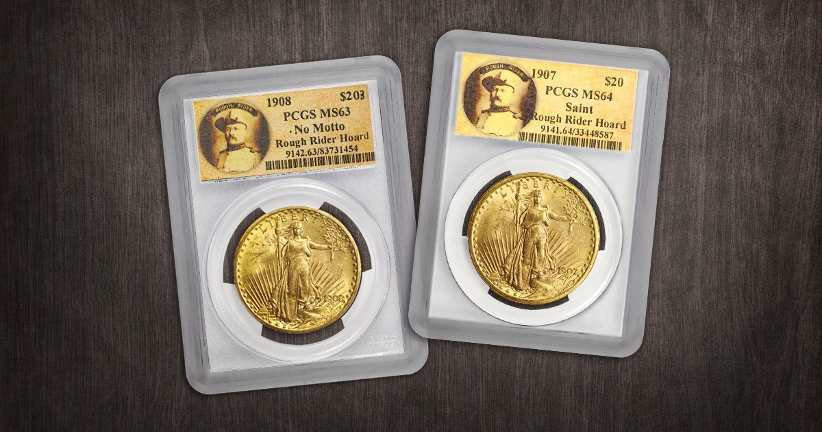 The Rough Rider coin hoard is a Mint State group of 1907 and 1908 Saint Gaudens $20 Gold Double Eagles steeped in history and rediscovered under mysterious circumstances.