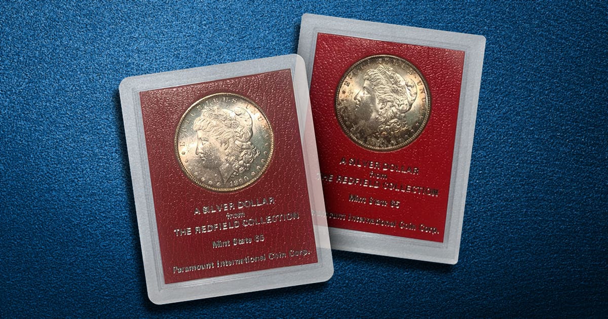 The silver dollars from Redfield’s hoard were put into Paramount Holders with three insert colors for the grade. Over the years, they were liquidated and are difficult to track or identify if they do not have a Paramount holder. These are highly sought after in today’s market and sell for much more than comparable Morgan silver dollars if they can be found.