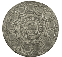 The reverse has 13 linked concentric rings, each with the name of a different colony. In the center are the words on three lines “WE -A RE-ONE”. The outer central ring is two words “AMERICAN CONGRESS.”