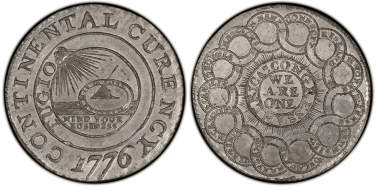 (1776 Continental Currency spelled “CONTINENTAL CURRENCEY,” Dollar. Obverse [left], Reverse [right].)