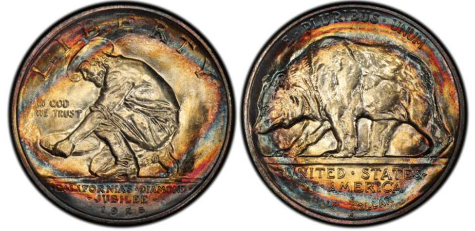 The Diamond Jubilee of the State of California was coming up in 1925 and the San Francisco Citizens’ Committee wished to have a commemorative half dollar to help defray the cost of the celebration. It was attached to another coinage bill and sailed through Congress.