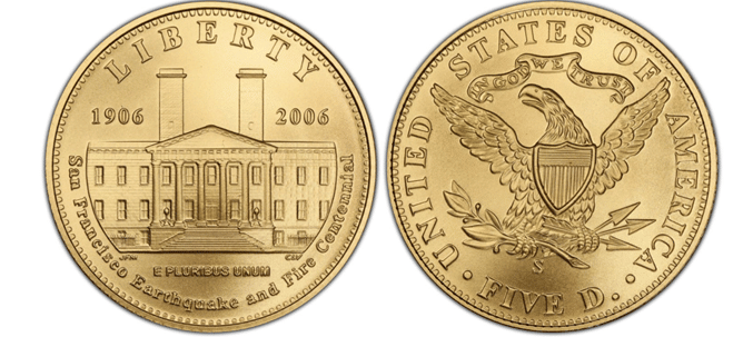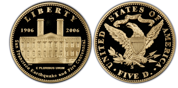 The $5.00 Gold Coin that was also authorized depicted the portico of the San Francisco Mint building, based on an 1896 drawing by architect A. B. Mullet. and A. B. Vickers designed the obverse. Above the building on the upper periphery is the word “LIBERTY,” and the dates “1906” to the left and “2006” to the right. Beneath the building is “E PLURIBUS UNUM” and the lower periphery has “SAN FRANCISCO EARTHQUAKE AND FIRE CENTENNIAL.”